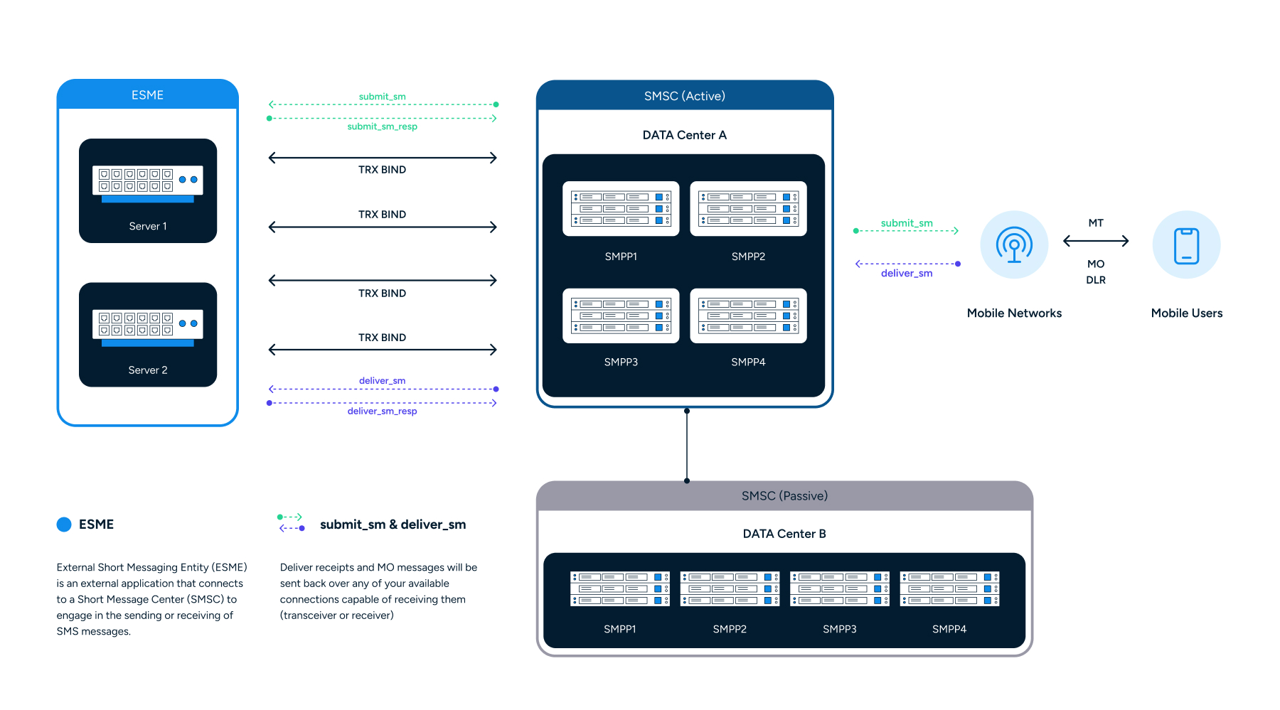 This applies to connections made to different servers, so this scenario is also possible if connection A is made to the SMPP1 server and connection B to the SMPP2 server.